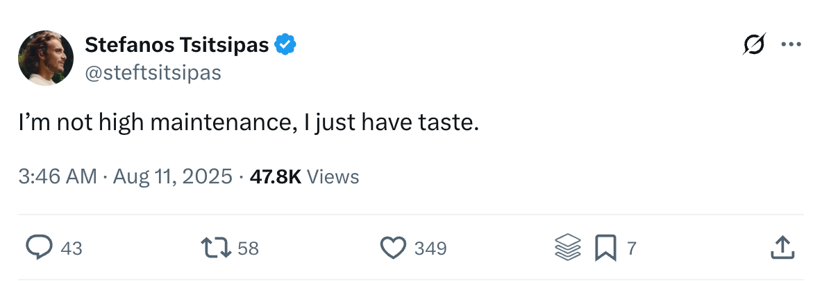🎾 You okay, bro?: Stefanos Tsitsipas, the social media poet laureate of tennis, was in his feelings at <checks timestamp> nearly 4:00 am on Monday morning, posting on X, “I’m not high maintenance, I just have taste.”